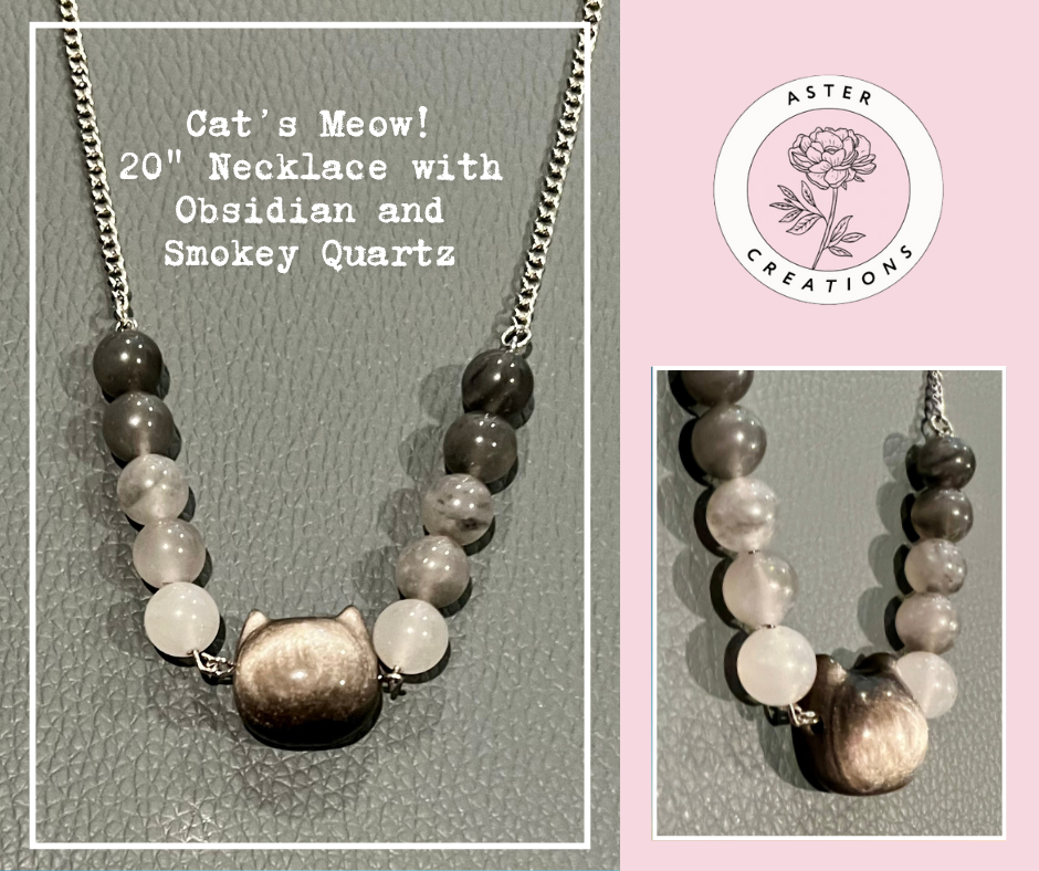 Become the cat's meow with this striking statement necklace featuring a stunning Silver Sheen Obsidian centerpiece and complementing Smokey Quartz beads.