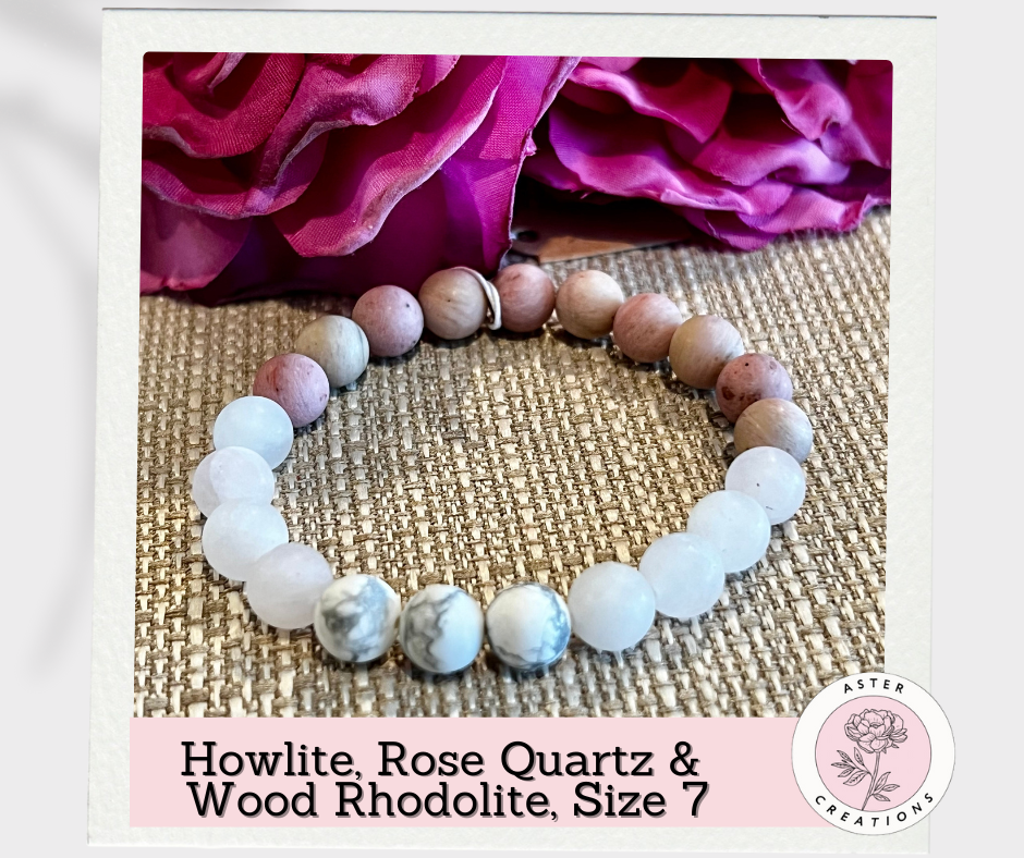 Howlite, Rose Quartz & Wood Rhodolite Bracelet, Size 7