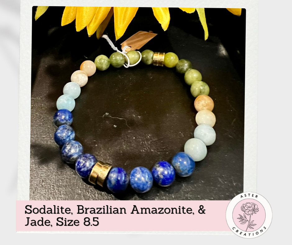 This genuine gemstone bracelet features stunning hues of Sodalite, Brazilian Amazonite, and Jade. Expertly handcrafted with precision and attention to detail, each piece reflects exceptional craftsmanship and dedication.
