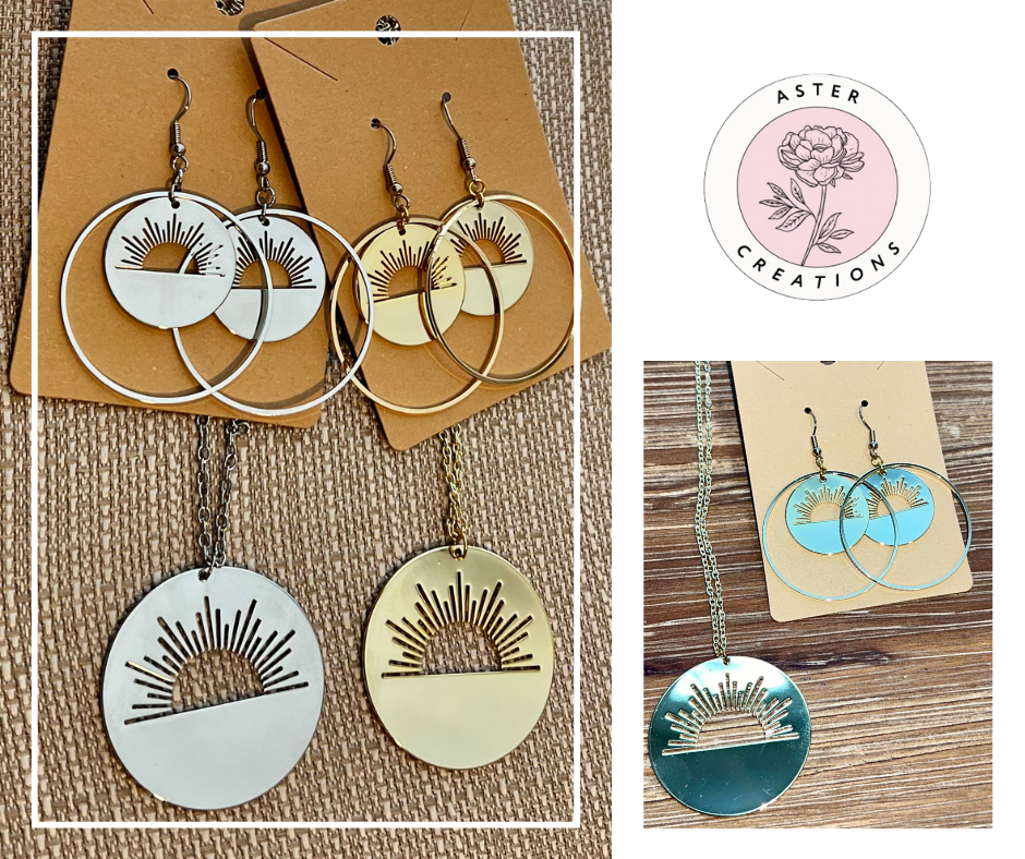 Necklaces are 28" in length with a 1 & 1/2 sunburst medallion. Earrings are 1 &1/2 inch hoop with 1/2 inch inner sunburst.